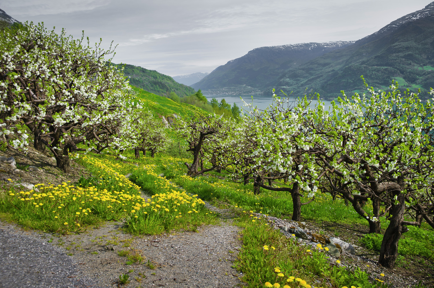 Aber es lohnt sich dann eben auch ein Ticket für einen Fjordkurzurlaub zu buchen, heißt: ab in den Hardangerfjord. Liegt in der Nähe, ist 170km lang und erfreut durch eine der schönsten Obstblüten in ganz Norwegen. Äpfel, Birnen, Pflaumen, Erdbeeren, Himbeeren und Kirschen, alles blüht im Mai bunt durcheinander und im Sommer kann man dann zum Pflücken wiederkommen. Und man braucht die Entscheidung auch erst zu fällen, wenn man bereits in Bergen weilt, da alles unkompliziert gleich vor Ort buchbar ist. Man tuckert also gemütlich per Schiff durch den Fjord und genießt das Blütenmeer der Obstbäume und die Berglandschaft nebst schneebedeckter Gipfel.