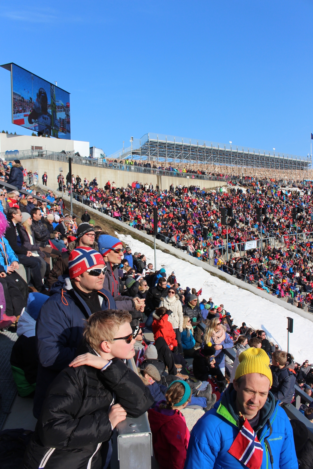 Am Sonntag ist der absolute Höhepunkt. Das Finale der Herren. Nationalflaggen, wohin man blickt, vor allem norwegische und polnische. Die polnischen Springer können auf Jubelunterstützung ihrer Fans setzen. Und die Norweger sind eh Ski-verrückt. Nebenbei wird im angrenzenden Langlaufstadium noch der entsprechende erste Platz ausgetragen. Auch die Königsfamilie ist da. Nah am Volk wie immer. Das ist überhaupt eines der schönsten Phänomene in Norwegen. Bei königs lebt man das Miteinander mit dem norwegischen Volk.