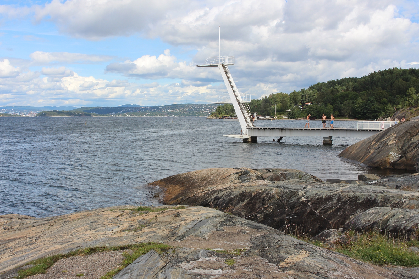 Am Ingierstrand angekommen breitet man sich einfach exponiert auf den Felsen aus und genießt. Die Sonne, die Mutigen, die vom Springturm in den Fjord tauchen, den Fjord, Oslo, Norwegen, das Lebensgefühl, einfach alles. Der örtliche Kiosk hält Iskrem bereit. Ja, so geht Badeurlaub im Norden.