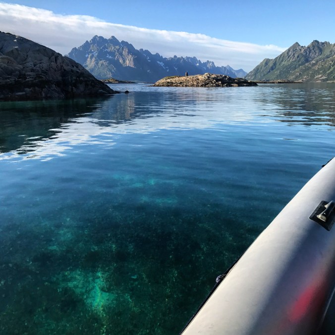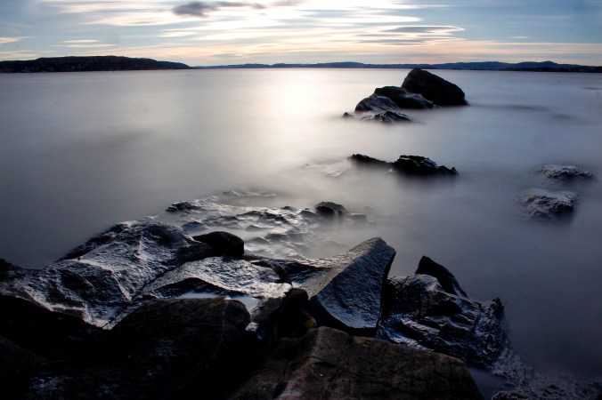 Auch am Strand mache ich den Versuch einer Langzeitbelichtung. Eigentlich steht die Sonne dafür zu frontal, aber heute herrscht so herrliche Ebbe, dass die Steine, die sich am Ufer im Wasser tummeln, so entzückend vom Fjordwasser umspült werden. Und probieren geht ja bekanntlich über studieren. Ein paar Norweger haben sich mit Einweggrill am Strand eingerichtet und wahrscheinlich fragen sie sich, was das denn werden soll, als ich mein Stativ aufbaue. Noch ein Vorteil von Langzeitbelichtungen. Man verlässt den Ich-knipse-mal-schnell-Modus und muss sich viel genauer überlegen, was denn jetzt aufs Bild kommen soll. Damit wird auch deutlich, dass es für jeden, der sich nicht für Fotografie interessiert, die Hölle ist, unbeteiligt daneben zu stehen. Wenn man an der Kamera hantiert und alles einrichtet, wundere ich mich immer wie schnell ein paar Stunden drauf gehen, bis man ein paar verschiedene Aufnahmen im Kasten hat. Dafür kann man aber auch nach der Fotoorgie mit aussergewöhnlichen Aufnahmen aufwarten.