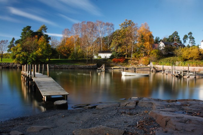 Seit ich als Reiseleiterin ständig in ganz Norwegen unterwegs bin, sind meine fotografischen Abenteuer in der Hauptstadt etwas eingerostet. Nein, so geht das nicht weiter. Zehn Tage tourfrei kommen da geradezu gelegen um fotografisch Neues auszuprobieren. Und Oslo hat sich sogar überlegt mit gutem Wetter zu glänzen. Für gewöhnlich bin ich auf Regen abonniert, wenn ich denn mal zu ausgedehnten Fototouren starten will. Diesmal nicht. Erste Station: Bygdøy. Die Museumshalbinsel ist für mich ja einer der Spazierganghotspots der Stadt und das Fotografenherz schlägt hier höher. Wenn man sich auf den Weg zur kleinen Bucht Huk macht, gerät man schon in Entzücken, wenn man am idyllischen Privatstrand vorbei kommt, wo die Boote verschlafen am Steg liegen. Ausserdem leuchten hier jetzt die Bäume in allen Herbstfarben. Das beste Licht gibt es in der goldenen Stunde, also kurz nach Sonnenaufgang und kurz vor Sonnenuntergang. Das Sternchen steht dann tief am Himmel, die Schatten sind weich und „goldene Stunde“ kann man hier wörtlich nehmen. Ein optisches Fest. Ich will mich diesmal an Langzeitbelichtungen versuchen, das wollte ich schon lange ausprobieren. Dazu setzt man der Kamera quasi eine Sonnenbrille auf, die den Sensor so weit abdunkelt, dass man problemlos auf Belichtungszeiten von mehreren Minuten kommt. Der Effekt: jedes Wasser wirkt wie glatt gezogen, das Idyllbarometer steht auf höchster Stufe.