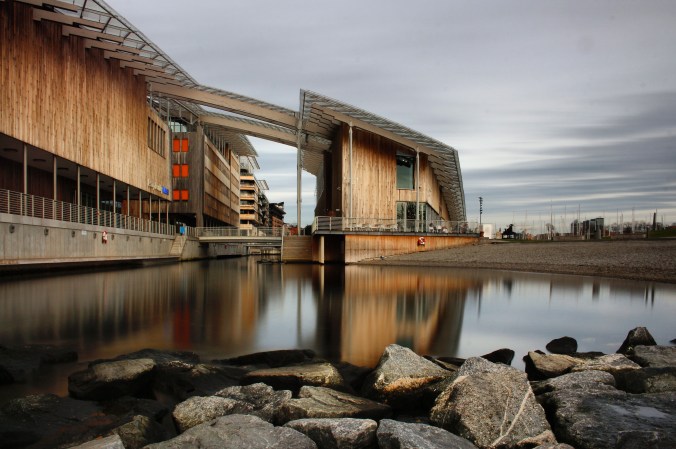 Nächste Station Innenstadt. Diesmal ist Tjuvholmen dran. Bekanntlich gibt es ja auch dort genügend Wasser, das den Stadtteil umfliesst. Nach einer guten Aufnahmeposition muss ich etwas suchen. Schliesslich braucht man ja für ein gutes Bild einen passablen Vordergrund um so etwas wie Bildgestaltung zu vollziehen. Ja, da muss man sich schon auf die Steine bemühen, die da vor dem Astrup-Fearnley-Museum herumliegen. Beim Einrichten sehe ich schon die Kamera im Fjord liegen und die Passanten finden es auch belustigend, wie ich da auf den Steinen herumkrieche. Irgendwie befindet man sich bei der Motivgestaltung immer in Bodennähe. Jetzt im Herbst ist eine kleine Isoliermatte extrem hilfreich, wenn man nicht auf den kalten Steinen sitzen oder gefühlt stundenlang in Hockposition verbringen will.